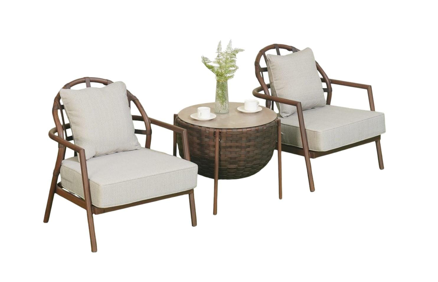 Continuing the set of black walnut tones and PE rattan elements, the iron frame is small and stable for outdoor use; The small-size design is flexible and does not occupy an area. It can be placed on the edge of a single-person sofa or sofa combination. It is convenient to place mobile phones, water cups, magazines and other personal items conveniently to meet the needs of local storage. When matched with 2077S(PE) sofa and large tea table, the material and style are highly compatible, which not only avoids clutter of space, but also makes the layout of outdoor leisure area more flexible, and shows the harmony of the set in details.