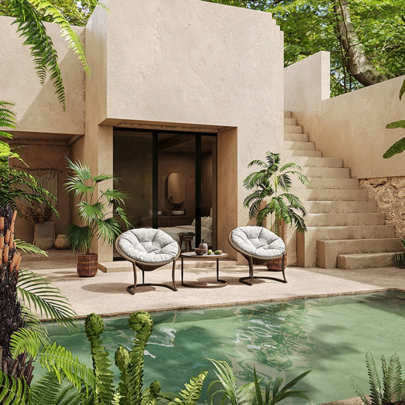 Camel sand color iron frame to create a lotus leaf smart shape, fit the body shape to sit comfortably, fully waterproof, sunscreen, mildew-proof, moisture-proof, corrosion-resistant. It is suitable for the villa courtyard and balcony, with the same color glass table top tea table, enjoying the scenery on the chair in the afternoon, placing drinks and snacks on the tea table, and easily unlocking the outdoor and comfortable leisure time.
