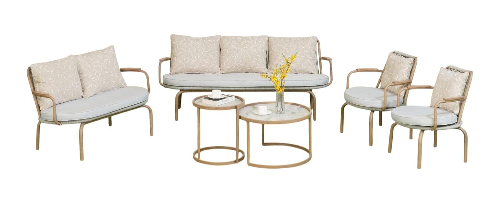 Teak-colored iron frame has a solid texture, rust-proof and anti-building adaptability to diverse outdoor environments (such as villa courtyards and commercial outdoor leisure areas); The spacious webbing sitting surface can easily accommodate three people to sit together, and is the main seat for family gatherings and friends to get together. The webbing is breathable and skin-friendly, with a stable structure of the frame, which not only guarantees the comfort of many people sitting together, but also takes into account the safety of use. It can be flexibly combined with single-seat and double-seat sofas to quickly build a complete outdoor leisure area, showing a natural and advanced leisure style.