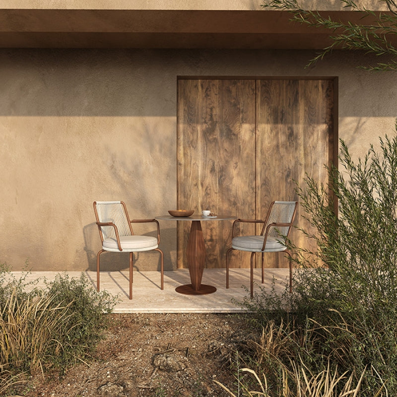 Teak color base with tempered glass desktop, fresh and transparent style and suitable for 2 people to use, the frame and desktop have excellent outdoor weather resistance, can easily meet the needs of waterproof and sunscreen, especially suitable for private villa courtyard, commercial restaurants and other outdoor leisure dining areas, for many people outdoor dinner scene to create a comfortable and leisurely experience, enhance the dining space exquisite feeling and style.