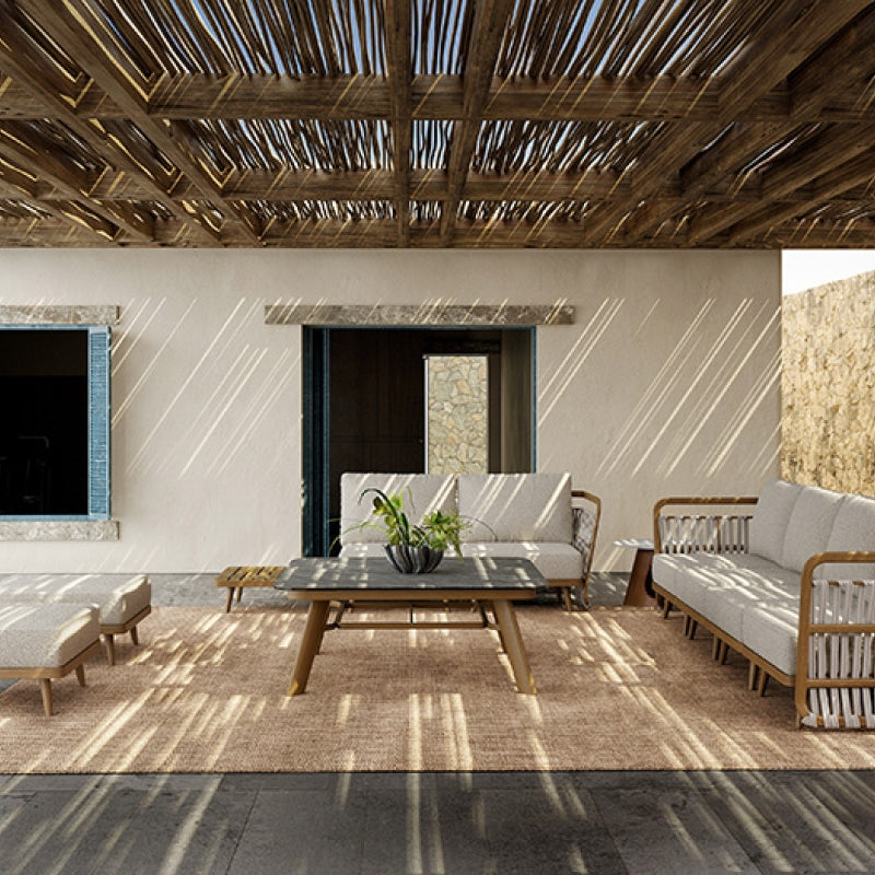 Teak color iron frame light gray soft bag, highly unified with 2385S sofa style, waterproof, sunscreen and corrosion resistance. It is suitable for balconies and courtyards. It is convenient to put feet in front of the sofa, which instantly relieves sedentary fatigue, makes outdoor relaxation time more lazy and comfortable, and details enhance the overall experience.